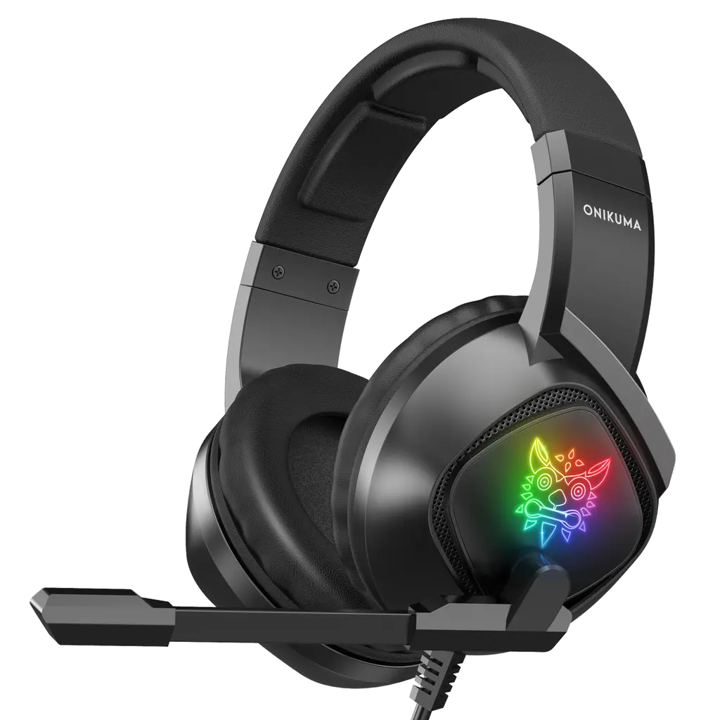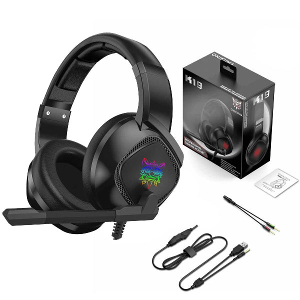 The Onikuma K19 is a budget-friendly gaming headset known for its 40mm directional drivers, noise-canceling microphone, and multi-platform compatibility. It features a retractable stainless steel and plastic headband, soft leatherette padding, and padded earcups for comfort. The headset includes a braided cable with a built-in controller for volume and mute, and a Y-splitter for connecting to PCs or laptops. While it offers decent sound for gaming and a functional microphone, the sound quality has been described as lacking in mids and highs, and the microphone can sound nasally.
