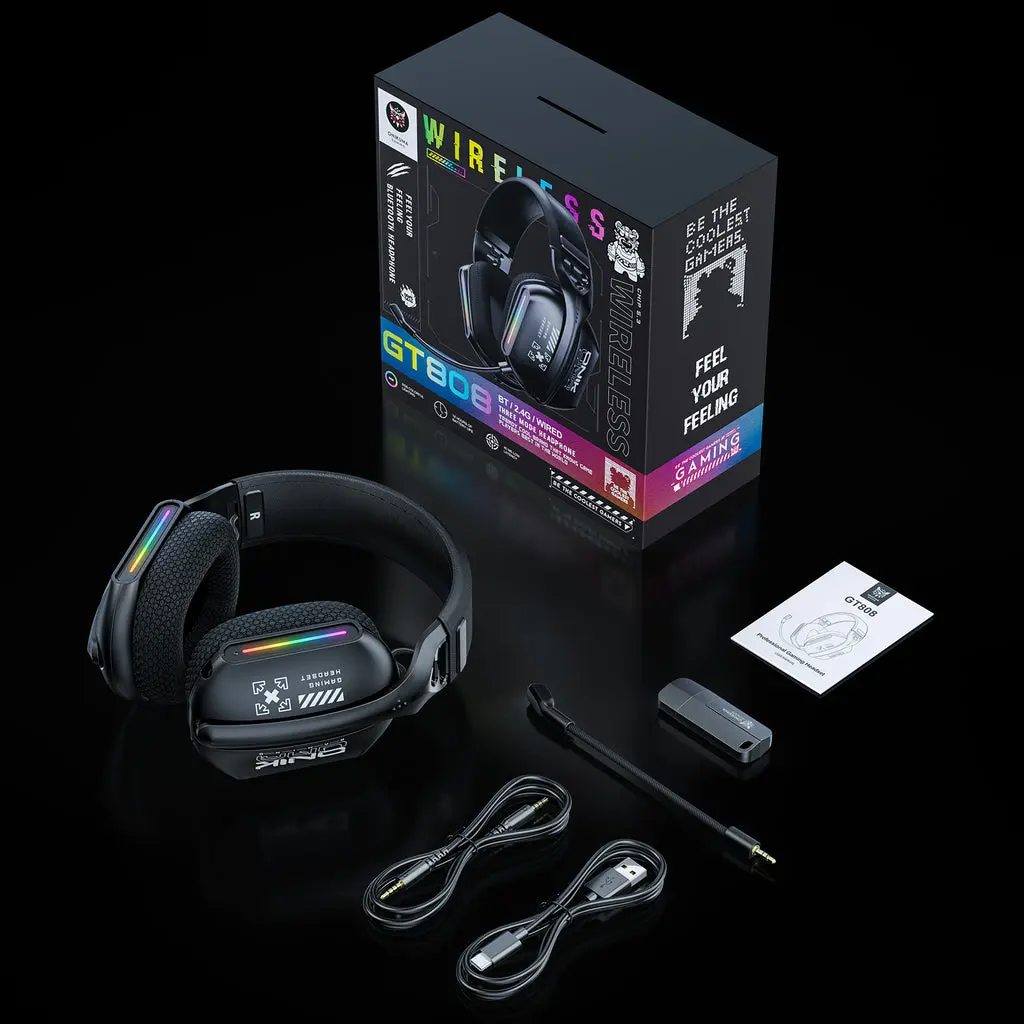 The Onikuma GT808 is a tri-mode gaming headset that offers both wireless and wired connectivity options. It features 2.4GHz wireless, Bluetooth 5.3, and wired (3.5mm) modes for versatile use across different platforms like PC, PlayStation, Switch, and mobile devices. The headset includes 40mm drivers for high-quality audio, a detachable, noise-canceling microphone, and customizable RGB lighting. It is designed with an ergonomic and comfortable fit, featuring breathable, sweat-wicking memory foam earcups.