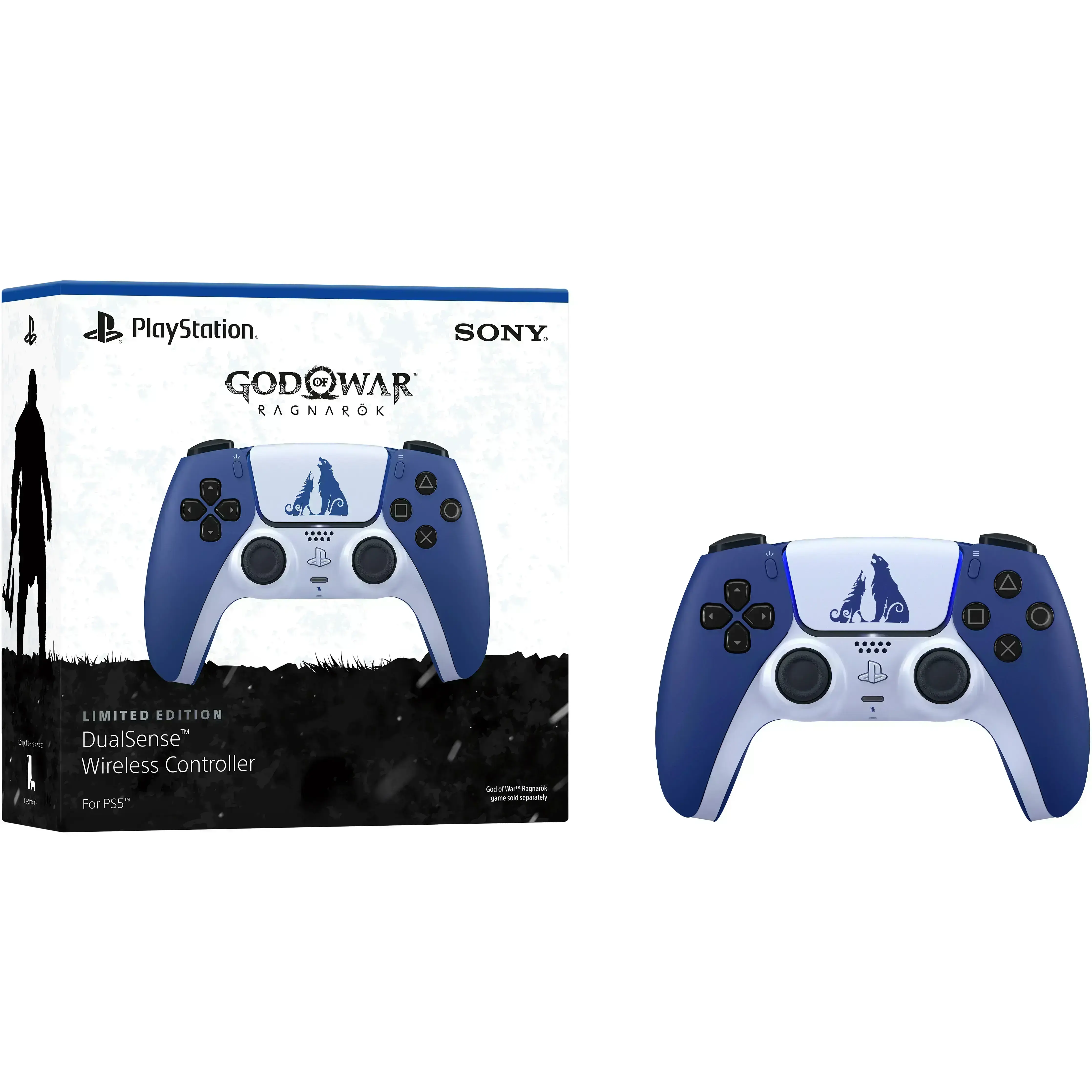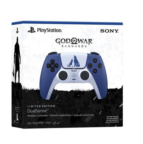The God of War Ragnarök DualSense wireless controller for the PS5 is a limited edition item with a unique two-tone design inspired by the Norse world of Midgard, featuring cool blue and icy white colors with bear and wolf insignia representing Kratos and Atreus It enhances gameplay with features like haptic feedback, adaptive triggers, a built-in microphone, and a 3.5mm headset jack, all while retaining familiar DualSense functionalities.<br />