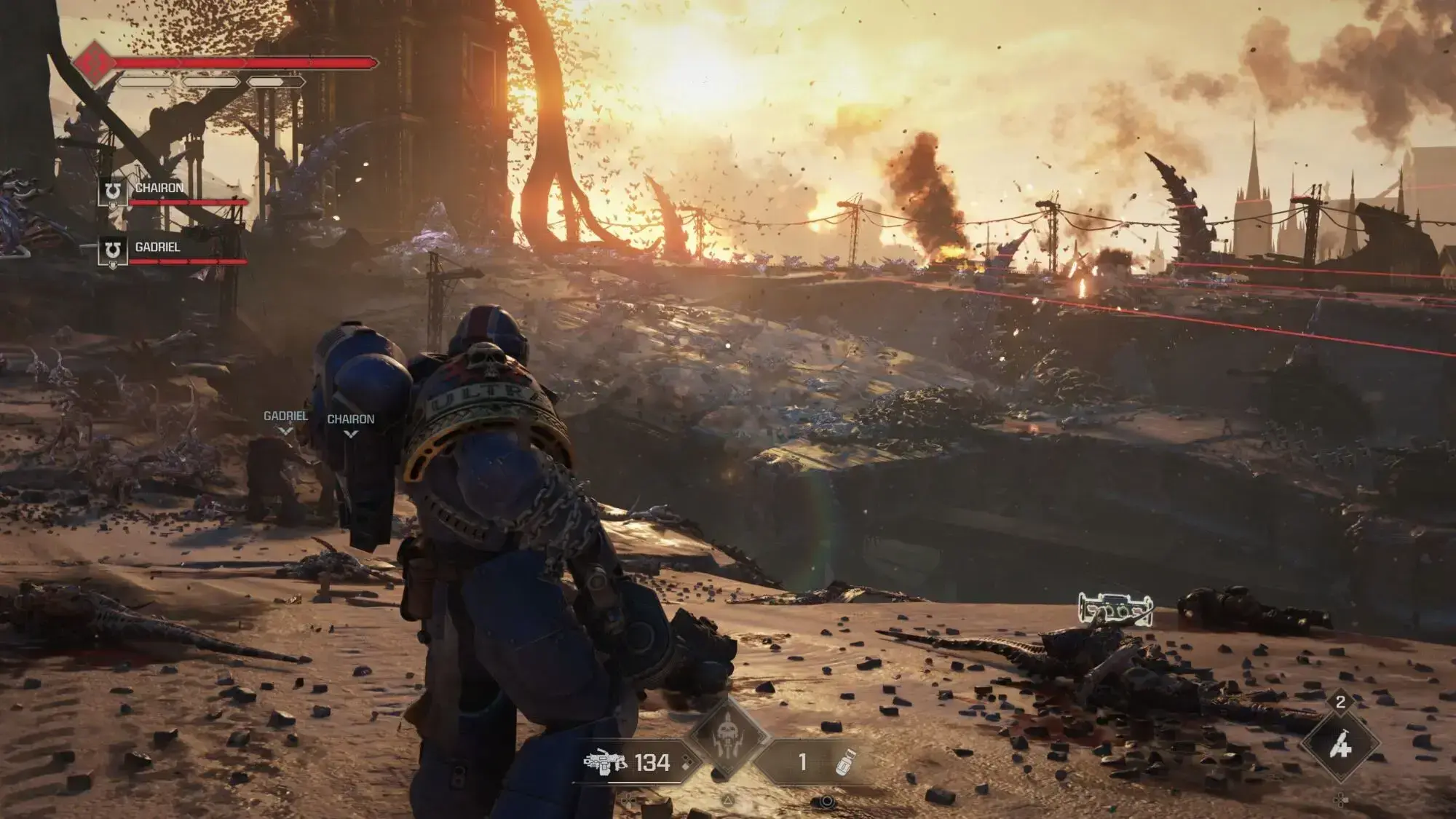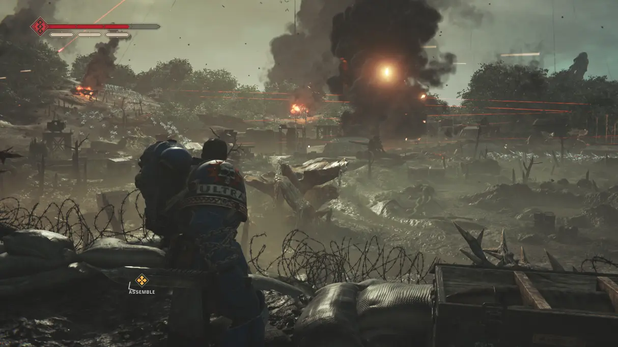 Warhammer 40,000: Space Marine 2 is a third-person action game for the PS5 where players take on the role of Lieutenant Titus, a Space Marine, as they battle hordes of Tyranids. The game features a mix of melee and ranged combat, brutal executions, and a focus on strategic gameplay as players manage their armor and health. It also includes a 3-player co-op mode and a variety of weapons and abilities for players to utilize. <br />