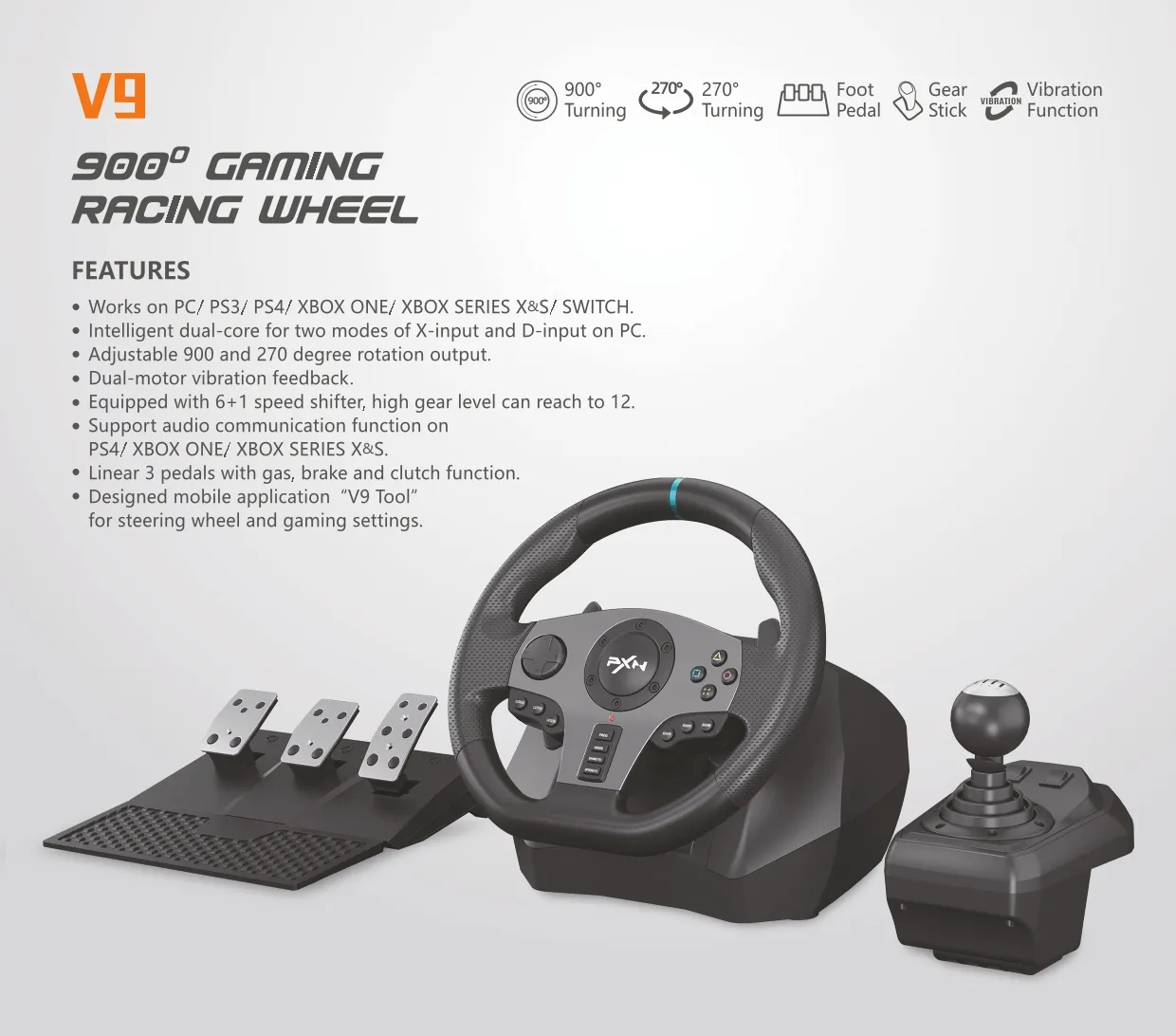 The PXN V9 is a racing wheel designed for a variety of gaming platforms including PC, PS3, PS4, Xbox One, Xbox Series X/S, and Nintendo Switch. It features a 270/900° rotation angle, dual vibration motors for realistic feedback, and includes a 6+1 gear shifter and three pedals. The pedals have Hall effect sensors and offer adjustable resistance. <br />