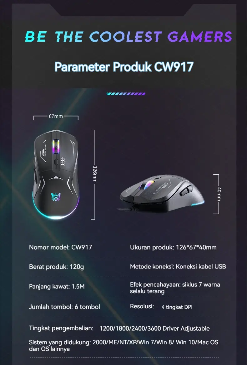 The Onikuma CW917 is a wired gaming mouse known for its customizable DPI settings, ergonomic design, and vibrant RGB lighting. It features a high DPI resolution, reaching up to 3600, and offers a comfortable, ergonomic grip for extended gaming sessions. The mouse is compatible with various systems like Windows and Mac, and its durable build ensures longevity. It also boasts multiple RGB lighting modes for a personalized aesthetic. <br />