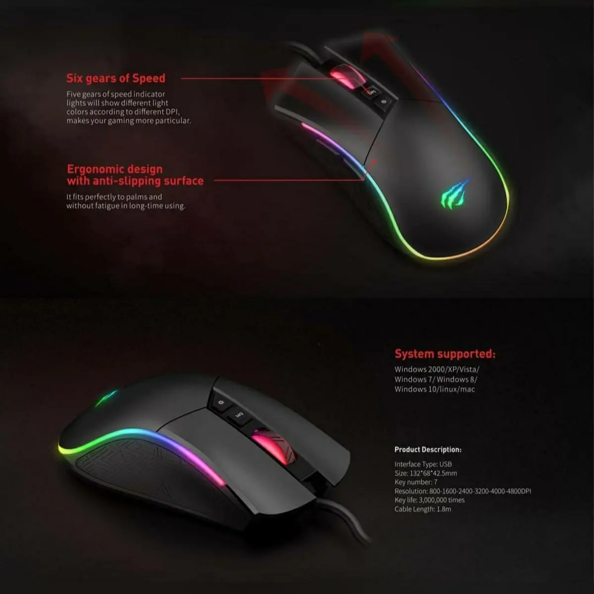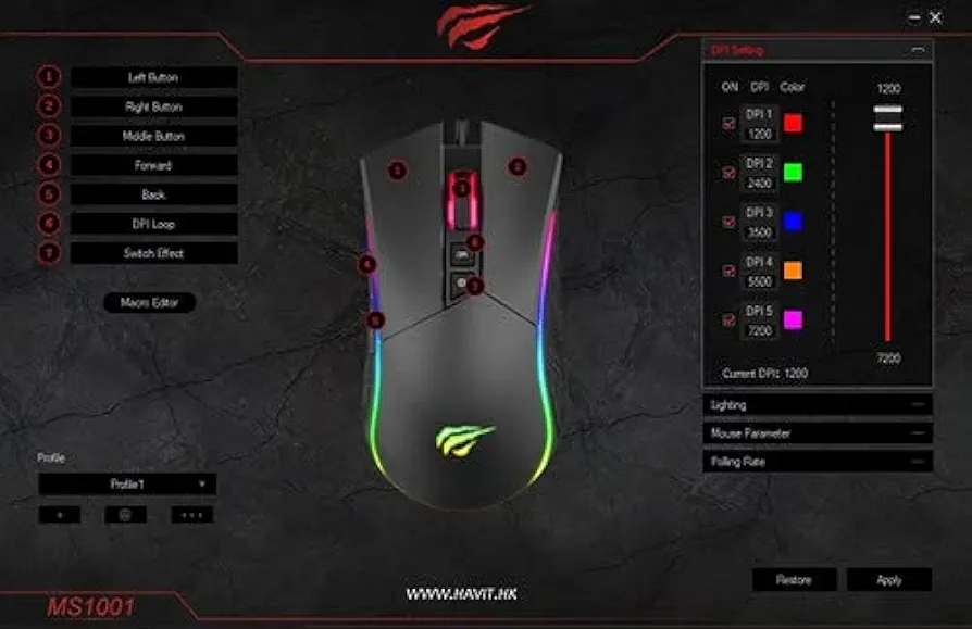 The Havit MS1001S is a programmable RGB backlit gaming mouse. It features an optical sensor with adjustable DPI settings ranging from 800 to 4800, allowing for customized sensitivity. The mouse also includes 7 programmable buttons, customizable RGB lighting effects, and an ergonomic design for comfortable use. <br />