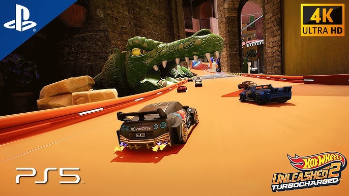 Hot Wheels Unleashed 2: Turbocharged on PS5 is an arcade racer that lets you control Hot Wheels vehicles in imaginative tracks set in everyday locations, featuring a robust track editor, vehicle customization, new abilities like Lateral Dash and Jumps, and new terrains that affect handling. It offers a story-driven campaign with a new story and hero-based challenges, alongside various quick race modes and online multiplayer, plus local split-screen co-op for two players. <br />