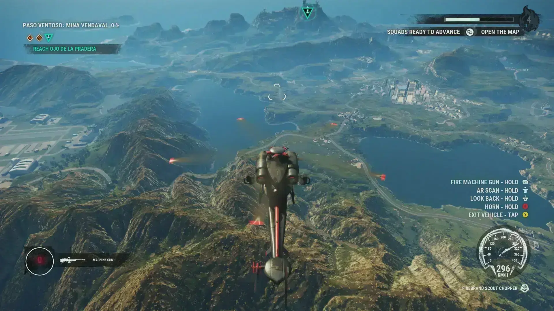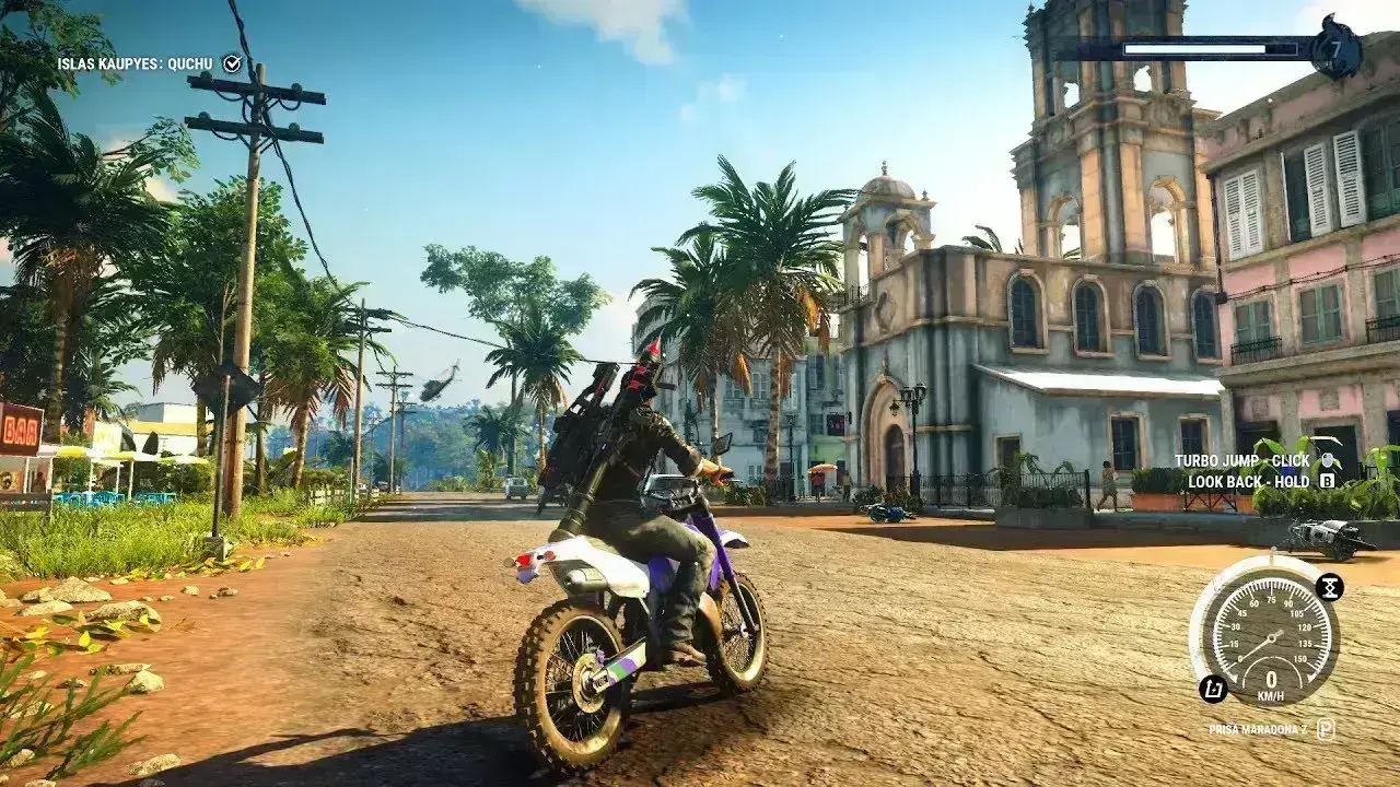 Play as Rico Rodriguez in a third-person perspective, utilizing his wingsuit, grappling hook, and various weapons and vehicles to navigate the world and engage in combat. <br />